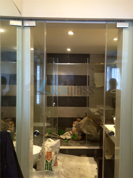 Vách ngăn phòng tắm cửa lùa đứng sử dụng kính cường lực - Temper 10 mm, với hệ thống ray lùa trượt treo (không có ray trượt dưới sàn), tay nắm âm hoặc tay đẩy, phụ kiện kẹp sử dụng bằng chất liệu inox không gỉ 304, hệ thống gioăng chắn nước ở cạnh và đáy cửa kính.