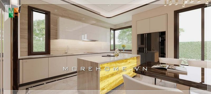 Mẫu thiết kế phòng bếp hiện đại, áp dụng đá ốp nhân tạo cao cấp cho các căn hộ, biệt thự, nhà phố.